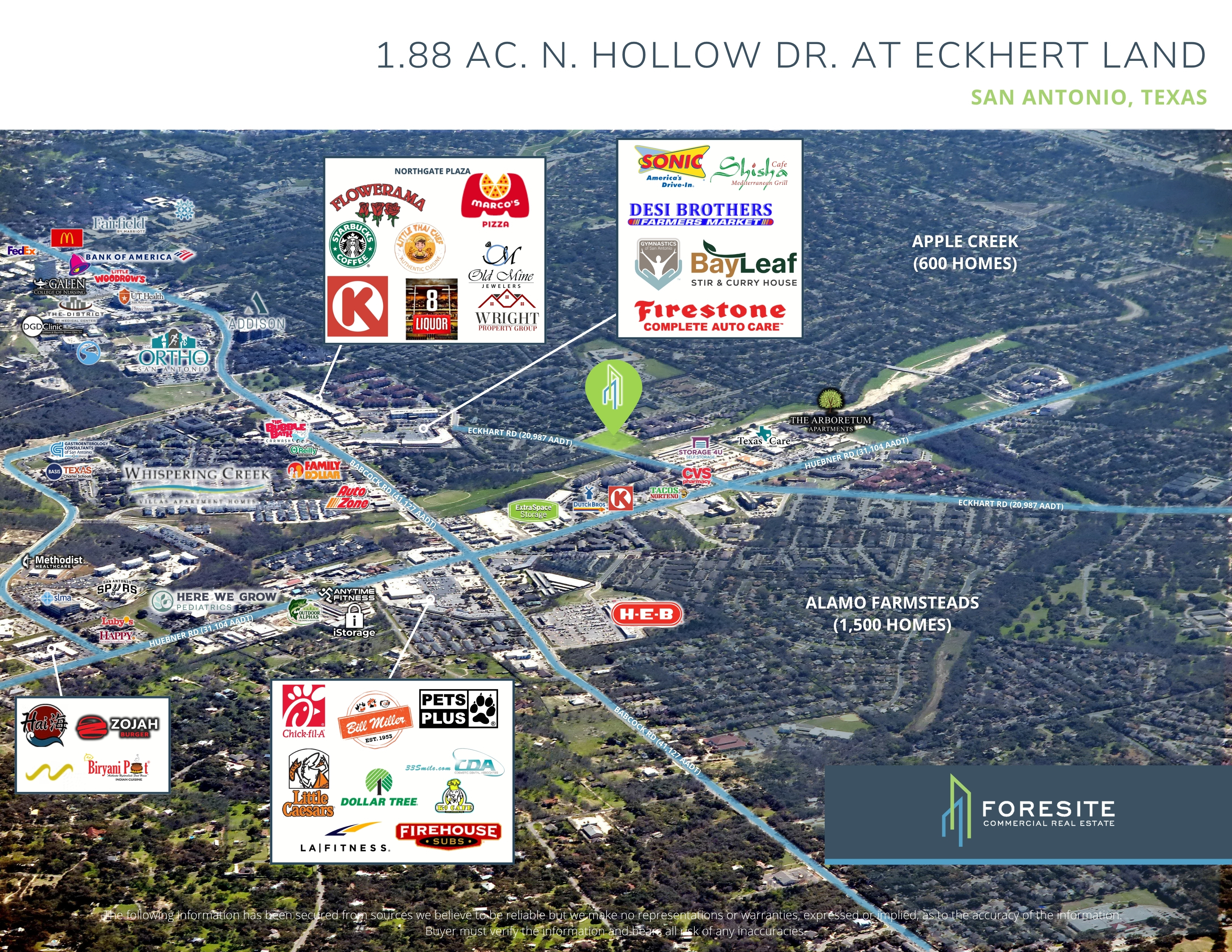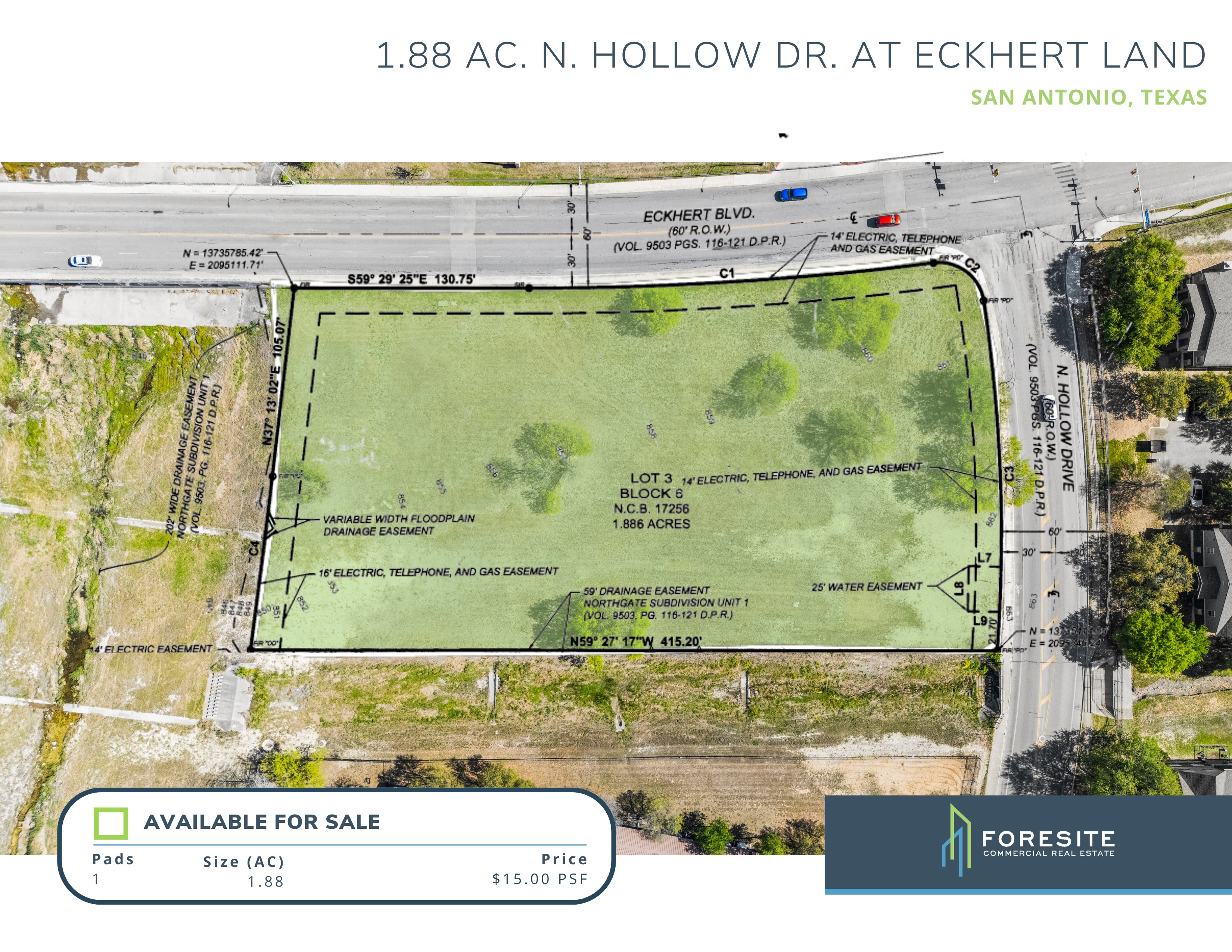 1.88 ac. N. Hollow Dr. at Eckhert Land JadeApril 20, 2026 1.88 ac. N. Hollow Dr. at Eckhert Land San Antonio, Texas 78214, USA Price: $1,232,312 Download Brochure Presented by Foresite Commercial Real Estate (210) 816-2734 Agents Daryl Lange Senior Vice President - Land Services & Brokerage Related Properties Available Alamo Crossing – Zarzamora & South IH-35 {29.3534727,-98.54050786252184} Created with Sketch. Available La Vernia/HWY 87 13867 U.S. Hwy 87 W, La Vernia, TX, USA Created with Sketch.