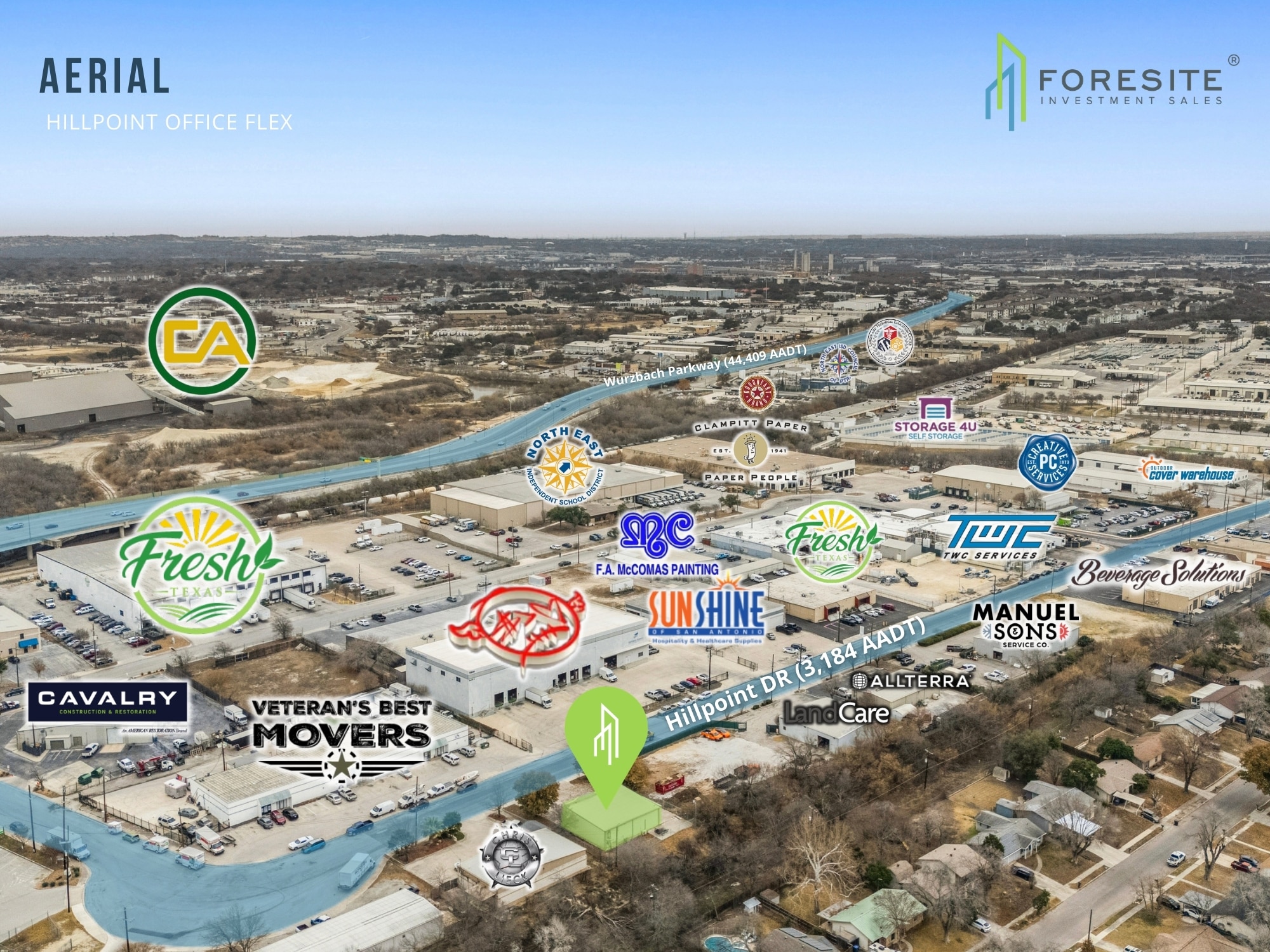 Hillpoint Office Flex JadeFebruary 25, 2026 Hillpoint Office Flex 10876 Hillpoint Drive, San Antonio, TX, USA Price: $600,000 Lease Term: Call Broker Download Brochure Presented by Foresite Commercial Real Estate (210) 816-2734 Agents Stephen Berchelmann Vice President - Urban Developments / Special Projects Related Properties Available Shops at Military 1635 Somerset Rd, San Antonio, TX 78211, USA Created with Sketch. Available North East 1604 Land at Universal City N Loop 1604 E, San Antonio, TX, USA Created with Sketch.